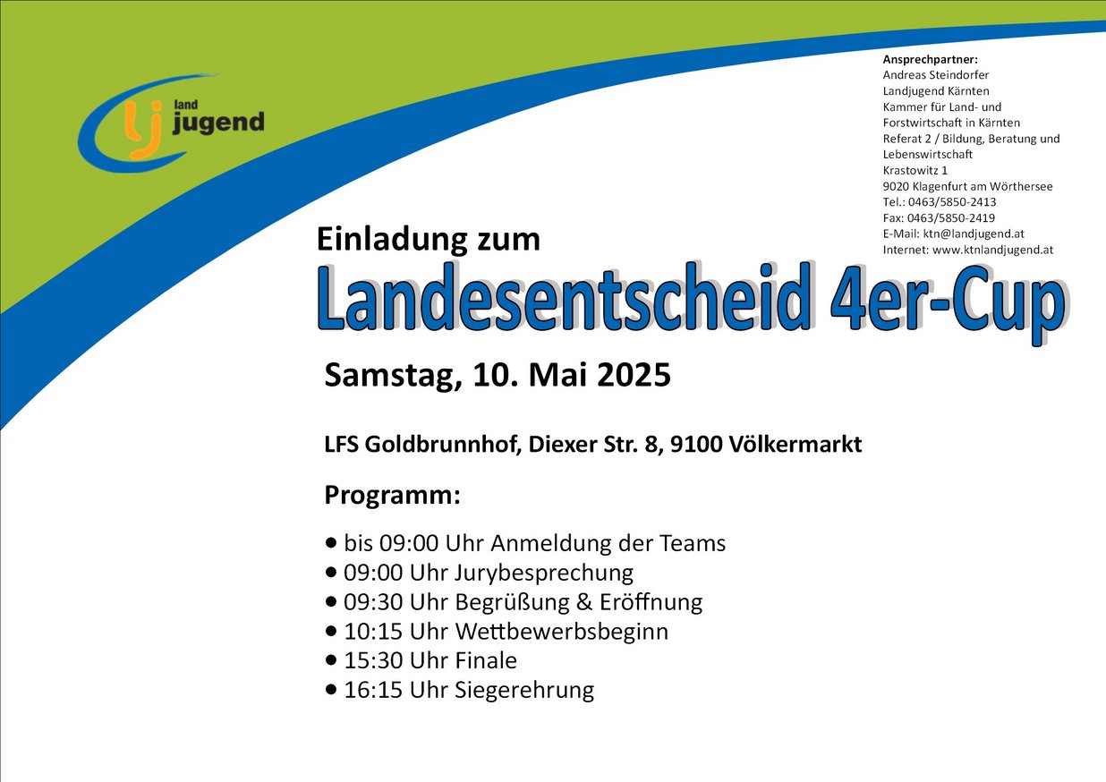 Der Landesentscheid wir heuer am 10. Mai von der Landjugend St. Stefan/Haimburg (VK) ausgetragen. Beim LE gibt es gesamt 11 Stationen zu absolvieren. Die Nominierung für den Landesentscheid obliegt den Bezirken. Jeder Bezirk hat die Möglichkeit drei Teams an den Start zu schicken. Sollte man es schaffen unter die Top 3 zu kommen, so qualifiziert man sich für den Bundesentscheid 4er-Cup und Reden welcher heuer in Vorarlberg stattfinden wird.