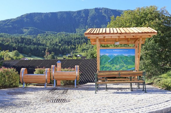 Wir nahmen die alten Pflastersteine heraus, reinigten sie und verlegten sie neu. Die baufällige Hütte und der alte Brunnen wurden abgetragen. Danach errichteten wir eine neue Hütte aus Lärchenholz als wettergeschützten Unterstand und erneuerten die Sitzgelegenheiten. Zwei Brunnen in Fassbinderoptik greifen die Tradition der Gemeinde auf und verleihen dem Platz ein unverwechselbares Erscheinungsbild.